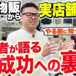 古着店の背後に並ぶ服を背景にノートPC越しで複数販路について説明する様子(テロップ:僕も複数販路に切り替えています)
